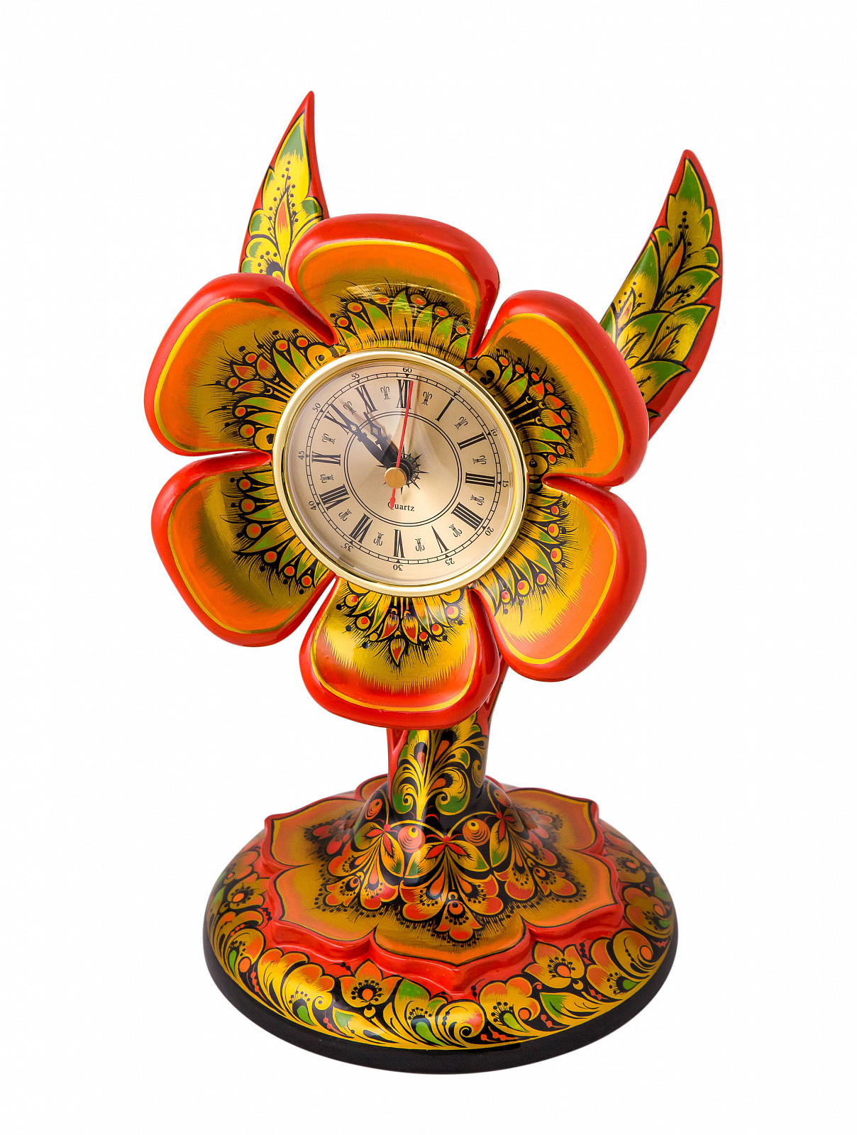 Часы настольные "Цветок". Размер изделия 280х160х160 мм. Часы изготовлены в полном соответствии с традиционной хохломской технологией золочения. Вырезаны из цельного дерева вручную. Имеет авторскую роспись в технике фонового письма. Роспись «Кудрина. Фантазия». Возможно разместить заказ на изготовление изделия с другими видами росписи. Срок изготовления персонального заказа 21-45 дней. Лаковое покрытие и многократный высокотемпературный обжиг делает изделие влагозащищенным и износоустойчивым. Все применяемые при производстве материалы натуральны и экологичны. Цветок символ чистоты, красоты и весеннего пробуждения. Эти часы располагают к себе своей изящной формой и росписью. Они изысканно будут смотрется в интерьере, как рабочего кабинета и офиса, так и дома. На каждом изделии имеется подпись автора росписи. Упаковка выполнена из брендированного картона.